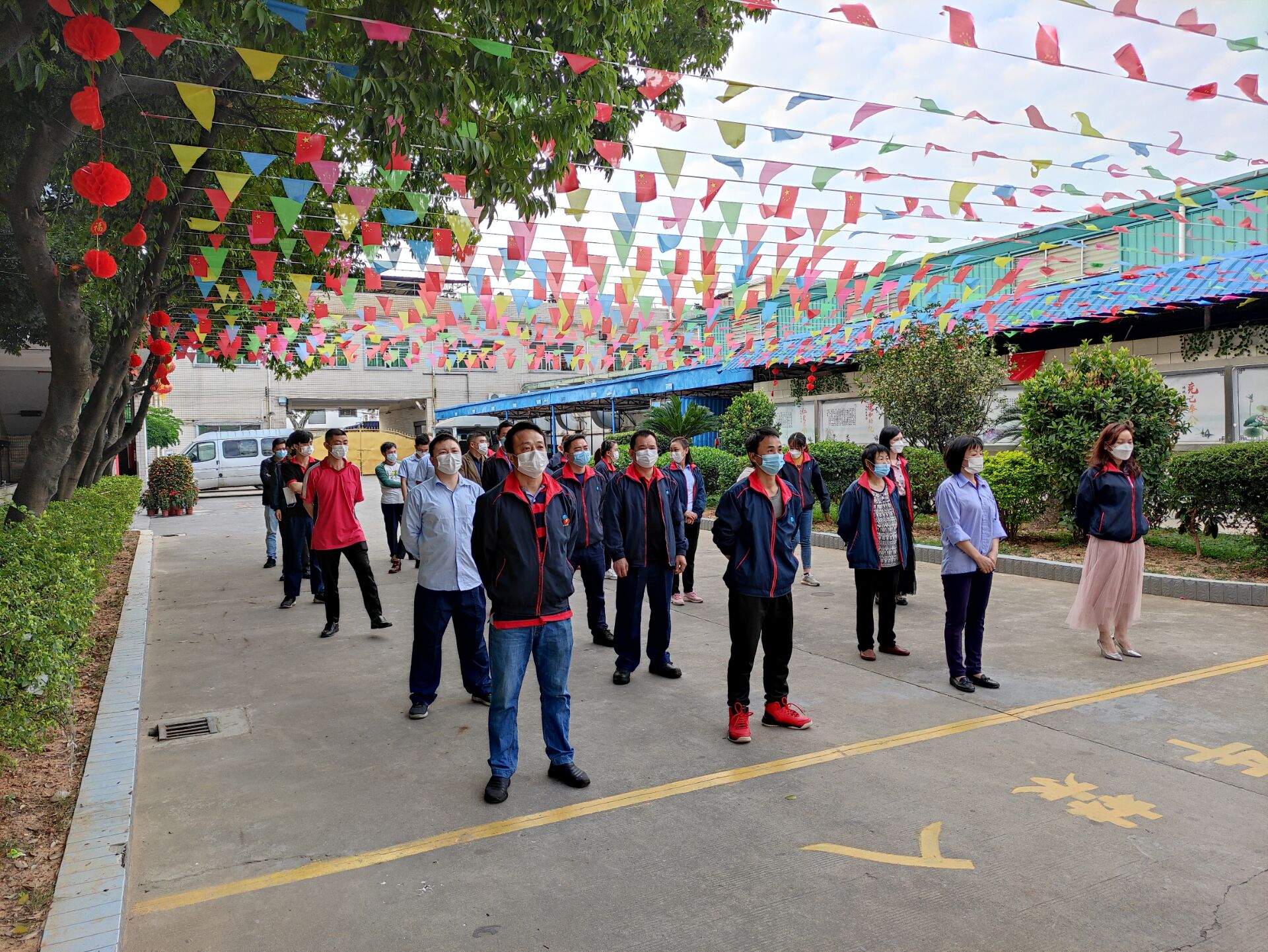 ▲周一早會(huì)盧經(jīng)理在室外給上崗人員宣導(dǎo)防疫知識(shí)