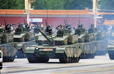新型坦克方隊位列裝備方隊之首,是唯一呈箭形通過天安門的方隊。這是99A式坦克參加預(yù)演(8月23日)。